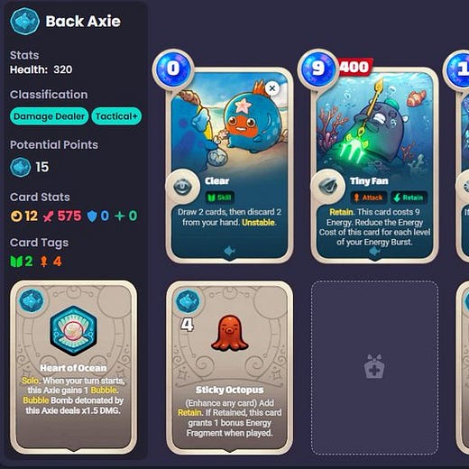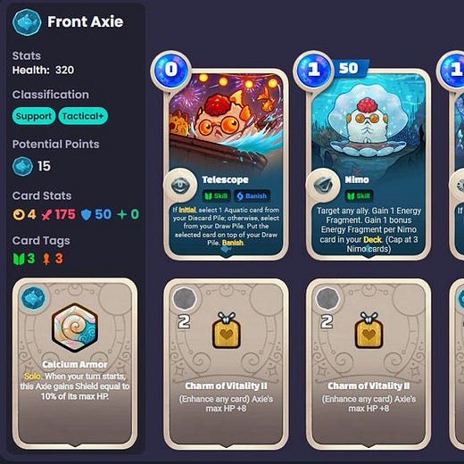 In April 2022, Axie creators Sky Mavis unveiled Axie Infinity: Origins, an optimized version of their original tactical card battler game that introduced card updates, a charms and runes crafting system, and real-time combat. As you can see from the tweet above, these new elements allow players to enjoy a lot of depth with unique, custom-tailored playing styles.