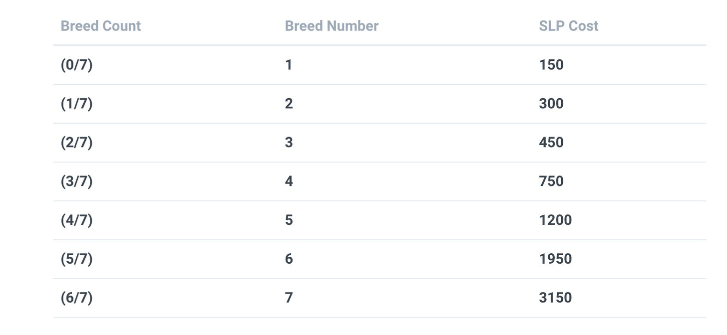 The major requirement behind setting up a good breeding farm, besides an initial purchase of high quality parents, is the SLP needed to breed your parents together. Recall from earlier in the article that SLP can be generated from playing the game, in addition to being bought off the open market.