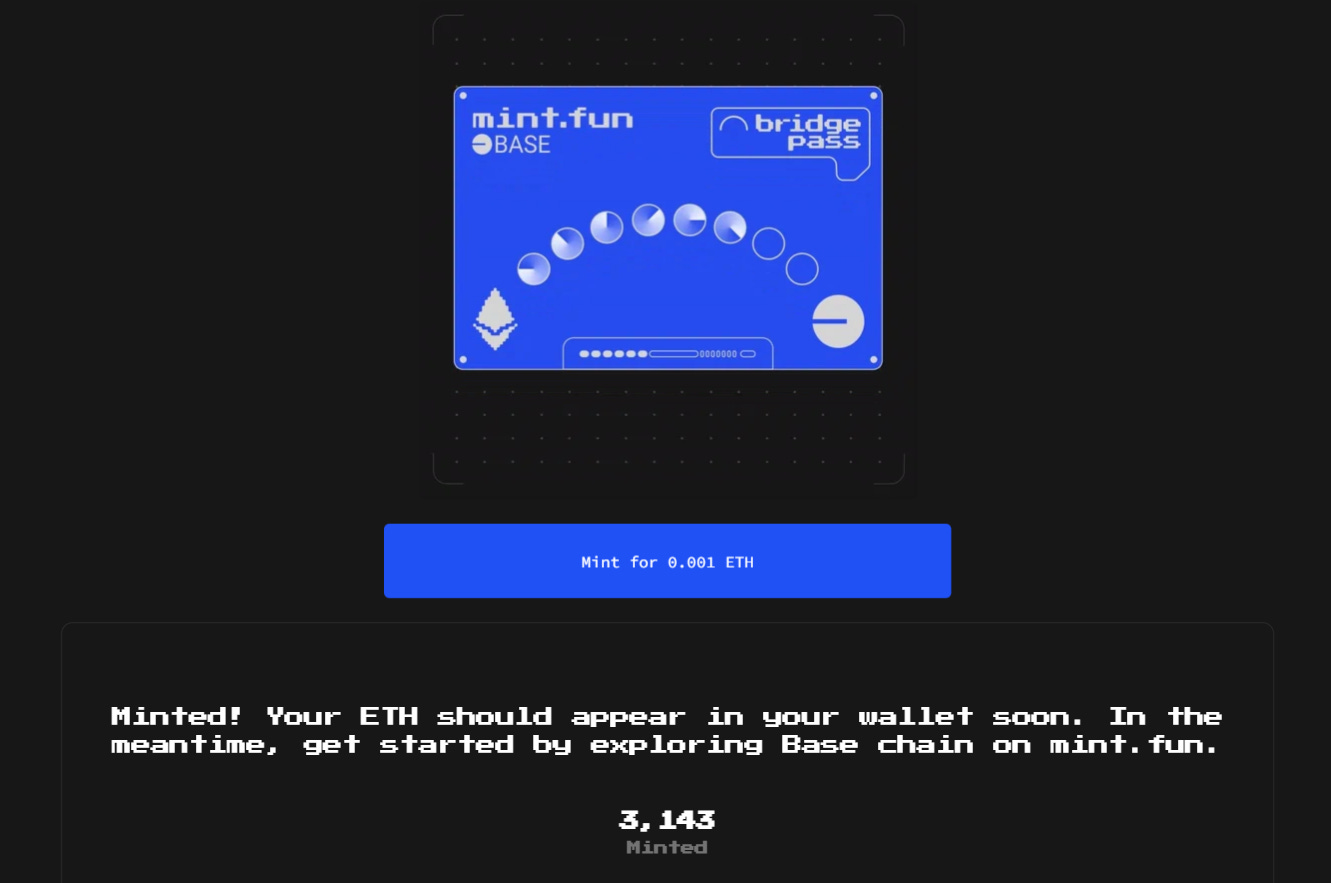 Another similar opportunity, the Base Bridge Pass, is currently available via mint discovery platform mint.fun. Mintable until August 31st, this drop lets you mint an NFT that in turn automatically triggers a small amount of ETH being sent to your wallet’s address on Base.
