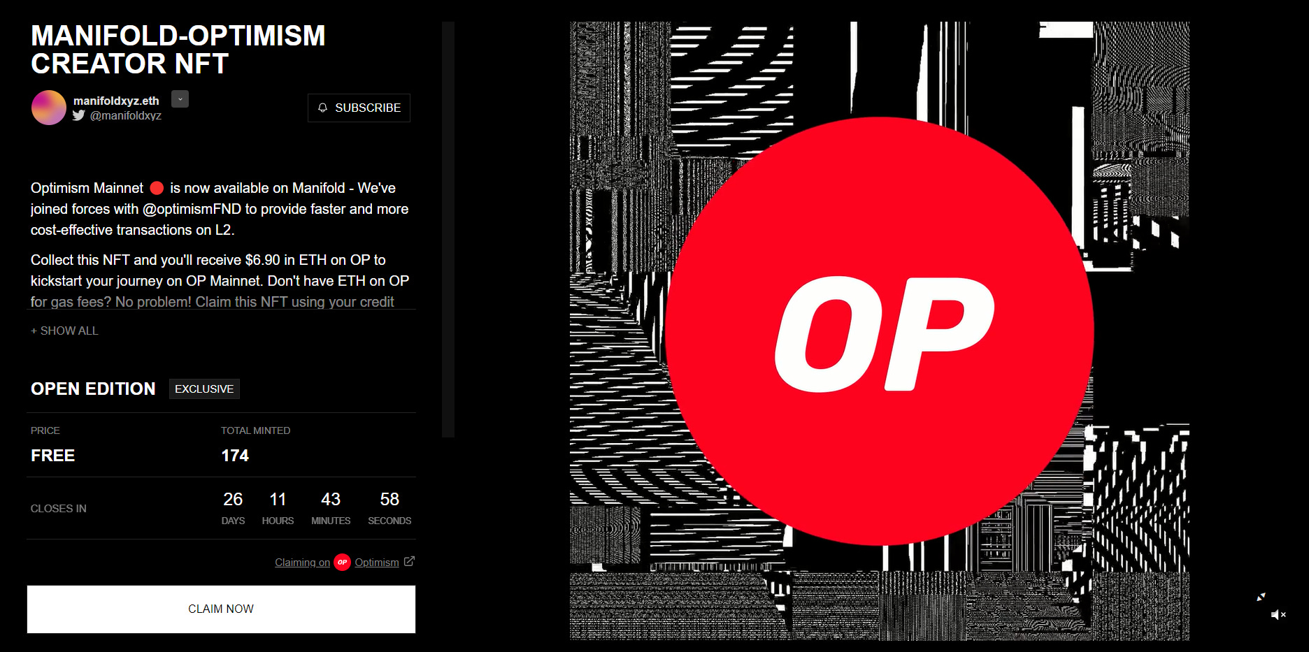 Summary: To commemorate Manifold’s newly launched support for minting L2 NFTs on Optimism, Manifold creators can now collect the “Manifold-Optimism Creator NFT.” Those that do will automatically be sent 0.004 ETH on Optimism, an amount that’s more than enough to start deploying your first L2 NFT projects.