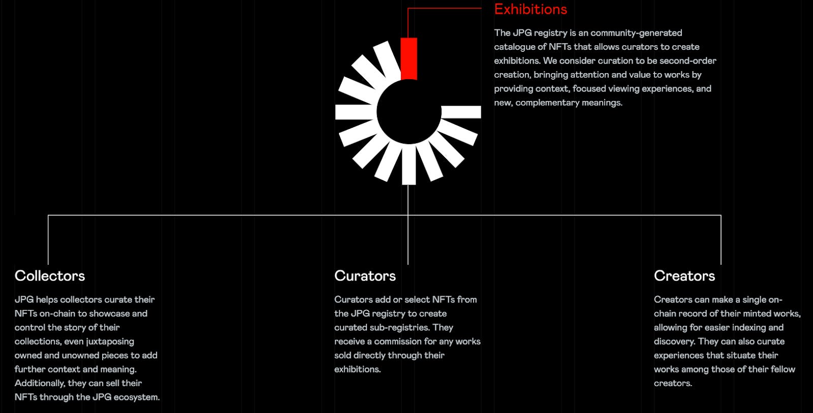 “At JPG we believe that curators don't have to be collectors, and that a truly decentralized culture is only possible when everyone, regardless of what they own, can share new perspectives and experiences through the exhibition medium. The JPG protocol has been developed with precisely this in mind.”