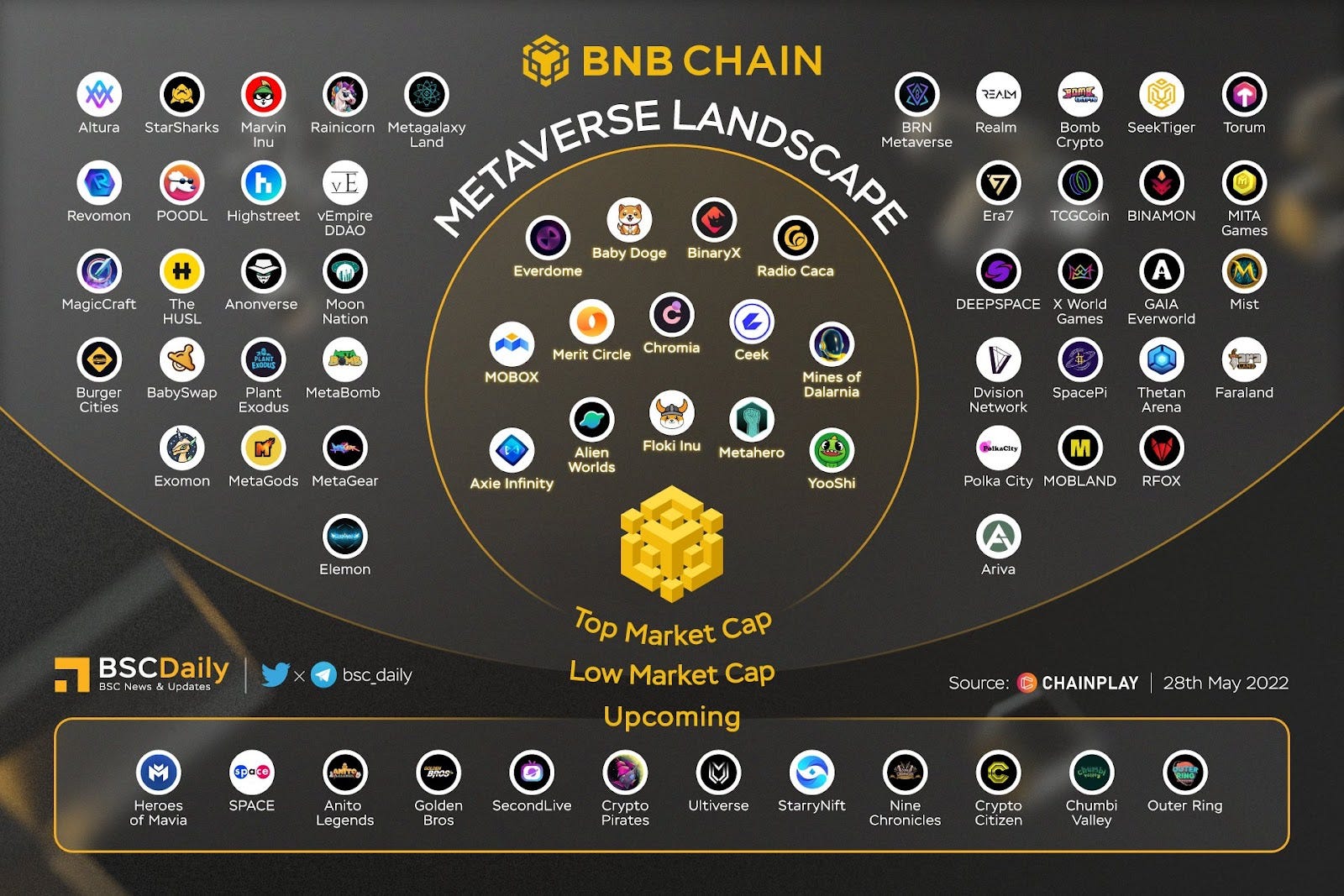 Relatively speaking, some of the larger metaverse projects building on BNB Chain today include AlienWorlds, Ceek, Merit Circle, Metahero, and YooShi.