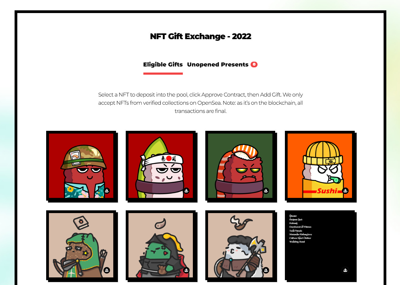 Ahead of the gift exchanges on Christmas Day, you can view all the deposited NFTs that are set to be randomly distributed via the poolās OpenSea profile page. In my opinion, thereās definitely some cool stuff in here so far!