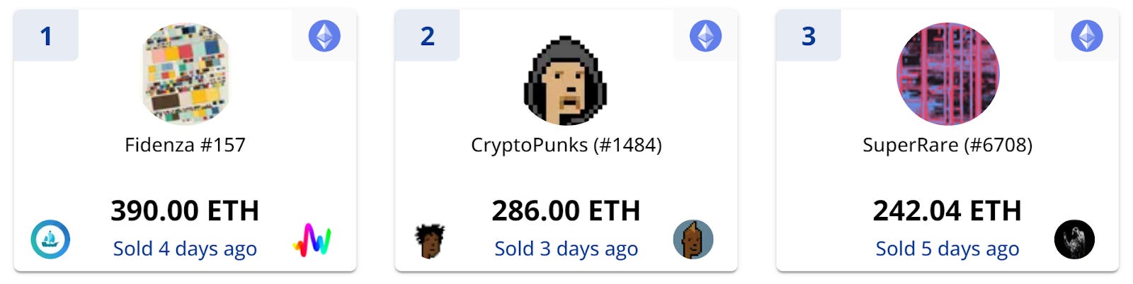 There’s been a lot of ‘Punks and Apes transactions in the top 3 biggest weekly sales lately, but in recent days we’ve seen more variety up at the top. Namely, the fresh faces this go ‘round were a Ξ390 resale of Fidenza #157 and a Ξ242 resale of FOMO by OG cryptoartist XCOPY.