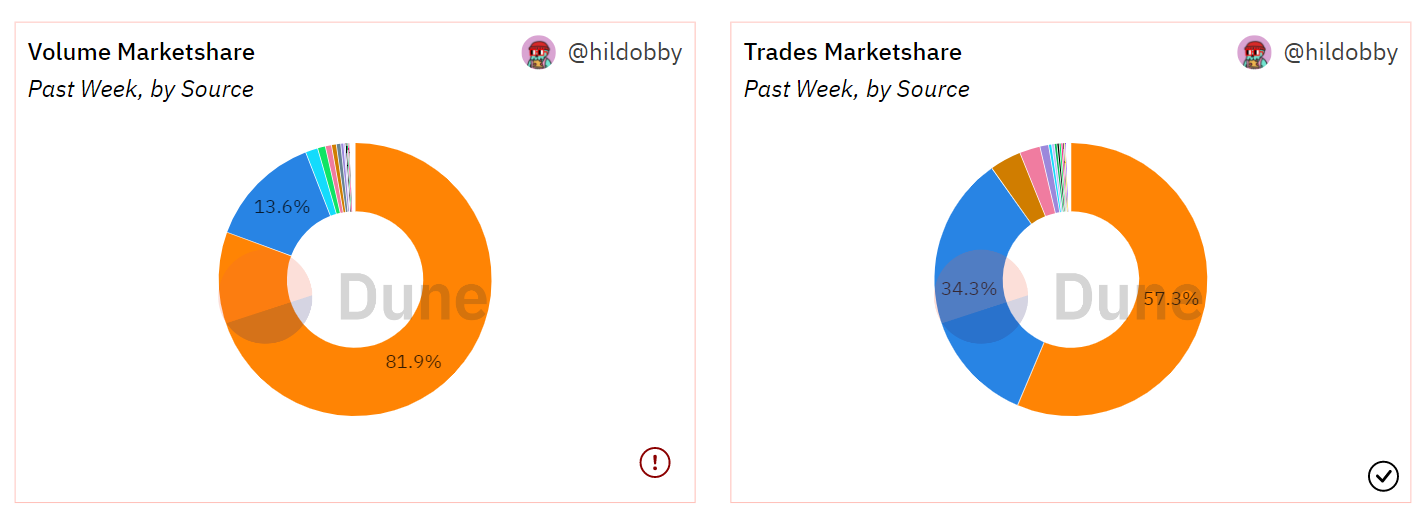 To understand just how dominant Blur is in the NFT trading scene right now, check out these graphs. The left one shows Blur facilitated over 80% of the NFT ecosystem’s trading volume on the week compared to OpenSea’s 14%, while the second shows Blur accounted for over 57% of all trades during that same span. Love it or hate it, Blur’s decidedly the king activity-wise right now.
