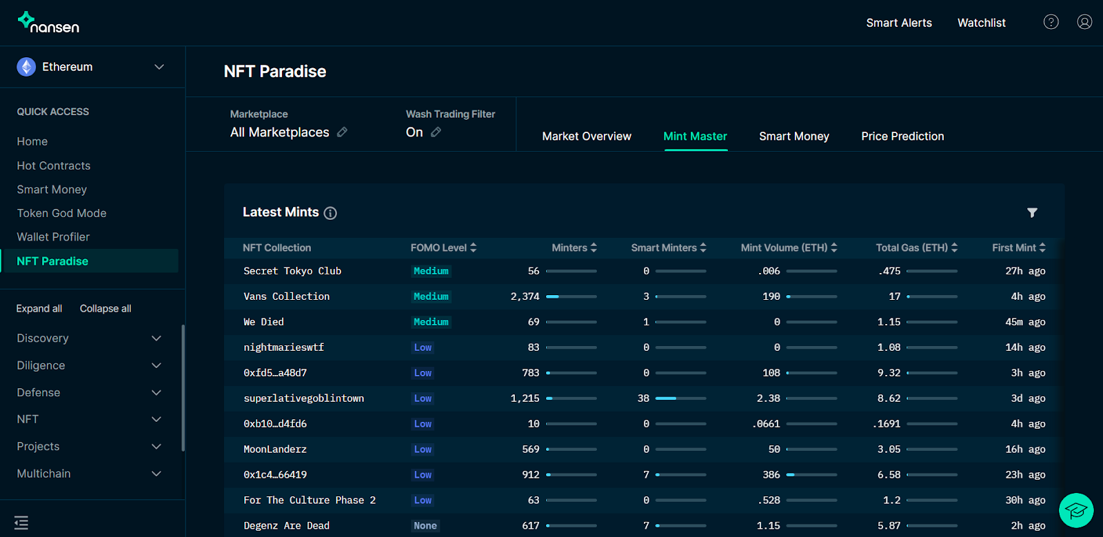 For example, I found WAGDIE via Mint Master by noticing on Friday that nearly 40 âSmart Mintersâ had participated in the projectâs mint. I was then able to accumulate a few before the project exploded, and now the floor price at the time of this postâs writing is 1.5 ETH each, so my subscriptionâs been covered multiple times over at this point. Of course, itâs not that every mint will be a win, but Nansen makes it simpler to surface signals in real time.