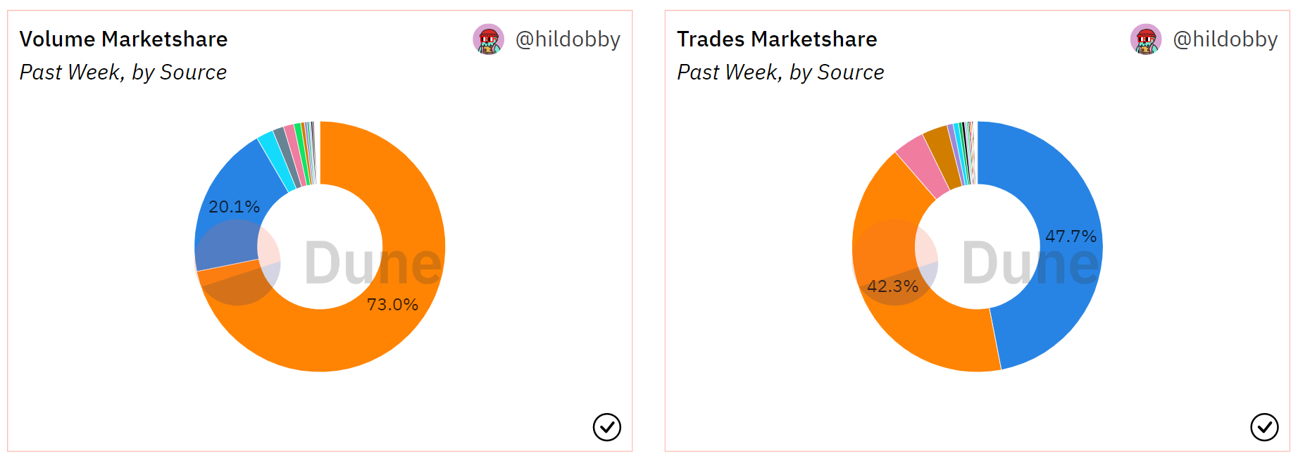 With regard to weekly volume share, OpenSea climbed from 19% to 20% and Blur climbed from 69% to 73% over the past week. In contrast, OpenSea saw the amount of weekly trades it facilitated slightly grow while Blur saw its share of trades slightly shrink. In other words? The $BLUR wars status quo continues on for now.Ā