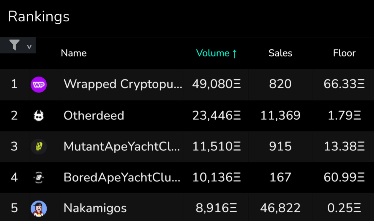 For the second week in a row, Wrapped CryptoPunks topped the NFT spaceās 7D volume charts with over 49k ETH worth of trades in that span.Ā Per usual BAYC, MAYC, and Otherdeed plots were no surprise in the top 5, so the fresh face this week was Nakamigos, the mysterious Sartoshi-linked collectionās that exploded onto the scene on the heels of its March 23 public mint.Ā