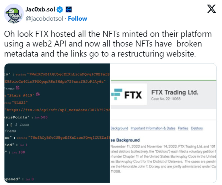 One thing I keep coming back to is the shuttering of the FTX NFT platform, which relied on a private server so now all its NFTs have broken metadata. Yikes.