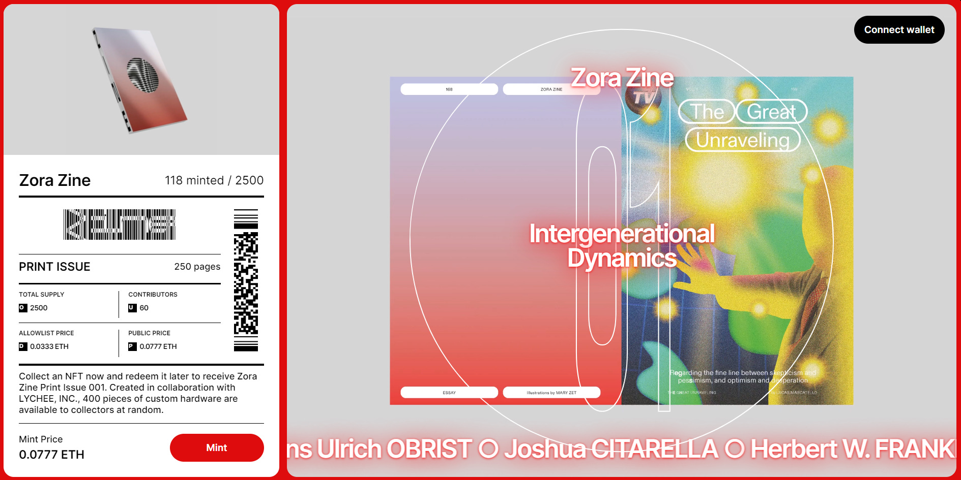 📝 Overview: Zora Zine Print Issue 001 is an NFT that can be redeemed later for a 250-page magazine that features work from over 60 amazing contributors on the theme of "Intergenerational Dynamics" in internet culture and crypto. Redemptions begin May 20, 2023.