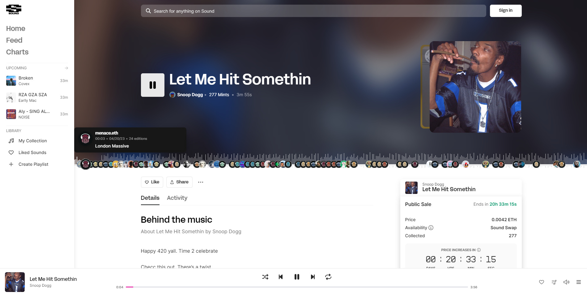 📝 Overview: The latest music NFT from Snoop Dogg, this track has been released via the new Sound Swap system, meaning it’ll run as an open edition for the first day before shifting over to a bonding curve approach for secondary buys and sells.