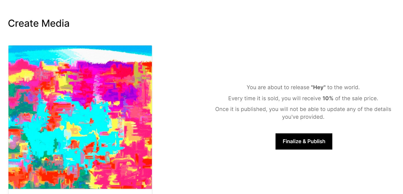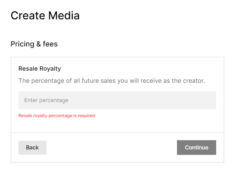 On the next page, you’ll be asked to set your royalty percentage. This is how much you’ll make back any time your NFT sells on the secondary marketplace. So let’s say you set your royalty at 10% and then your piece resells for 1 ETH one day. You’ll automatically get 0.1 ETH in your wallet as a royalty from that. Input your desired royalty amount and press “Continue.”