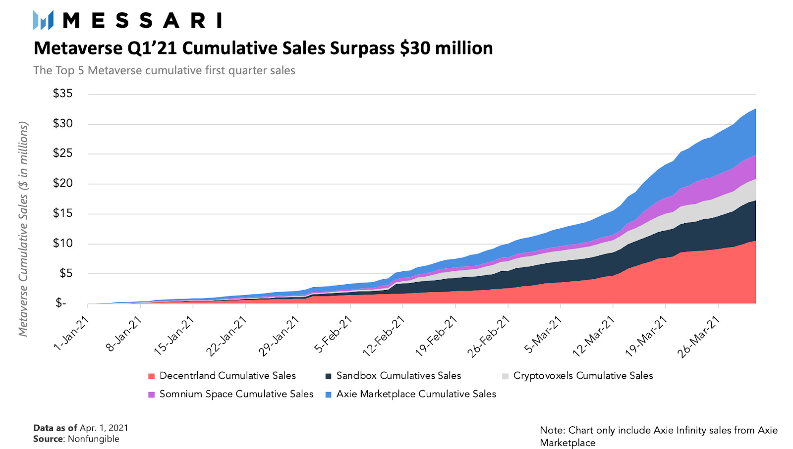 As they exist today, metaverses are digital outskirts – they’re sparsely populated, unsettled lands teeming with untapped potential. The early settlers of the outskirts are the crazies and the speculators. At the end of 2020, all time Metaverse sales exceeded $55 million ($20 million which came in 2020 alone). Within the first quarter of 2021, Metaverse sales have already surpassed $30 million.