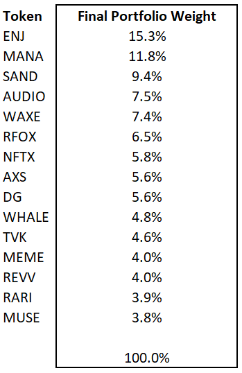 This leaves us with a list of the tokens that are ready for index inclusion. The MVI uses a combination of square root of market capitalisation and liquidity weighting to arrive at the final index weights. We believe that liquidity is an important consideration. The space overall is rather nascent still and shallow liquidity complicates on-chain rebalancing and portfolio allocation.