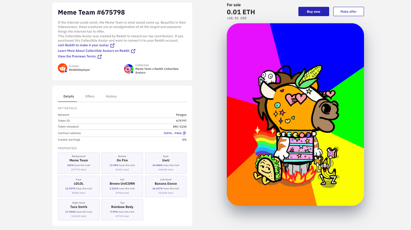 For the full product launch this week, Kraken NFT added support for the Polygon network, so now you can manage your Ethereum, Solana, and Polygon NFTs all from your same Kraken account. To welcome Polygon in with a bang, the platform also just added support for the Reddit Avatars collection, which has exploded in popularity since last fall.Â