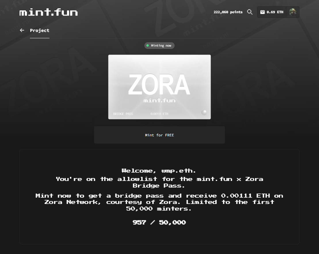 Did you mint a !fundrop pass yesterday or prior? Then you’ve been allowlisted for the Zora Network Bridge Pass mint on mint.fun! It’s a free mint on the Zora Network that automatically “bridges” 0.00111 ETH to your address on the new L2 for future gas costs, gifted via Zora. Next mints on the house!