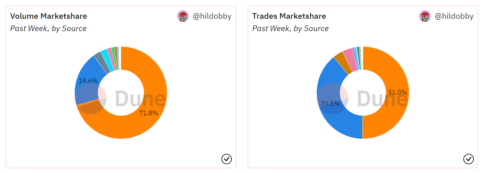 Notably, Blur’s stranglehold on the NFT economy receded some over the past week, during which its volume marketshare dropped from 77% to 72% and its trades marketshare dropped from 56% to 51%. That’s not a massive plunge, but it is stark difference from recent weeks when Blur either was gaining ground or staying steady in its dominance. Is this decline a sign that the pull of $BLUR rewards are starting to wane? For now, we’ll just have to wait and see.