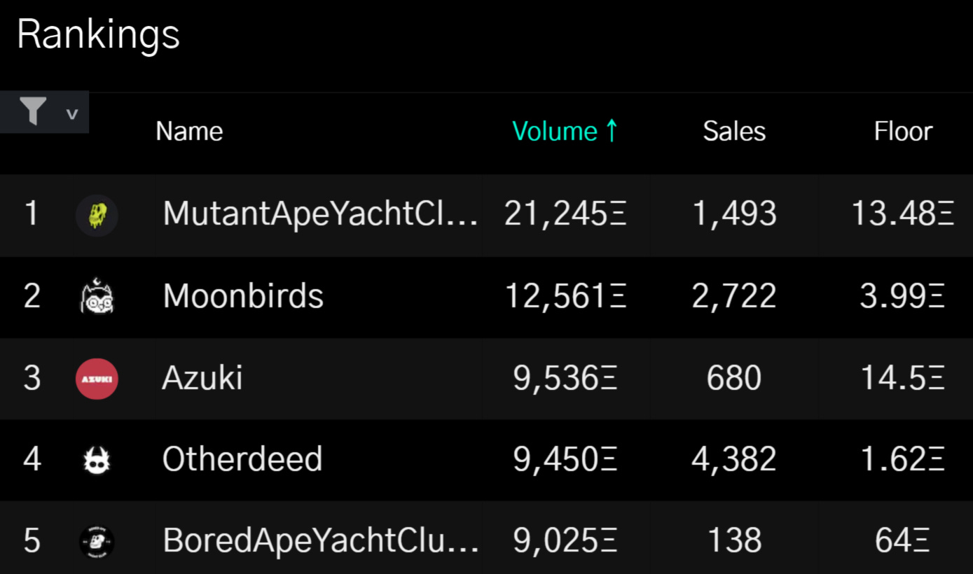Another week, another dominant performance by MAYC atop the 7D NFT volume charts. The Moonbirds collection also continues to see major volume activity, too, as bear market blues has lately led to surges of buy and sell pressure around the project. Azuki, Otherdeeds plots, and BAYC all facilitated over 9k ETH worth of trades on the week to round out the top five here.