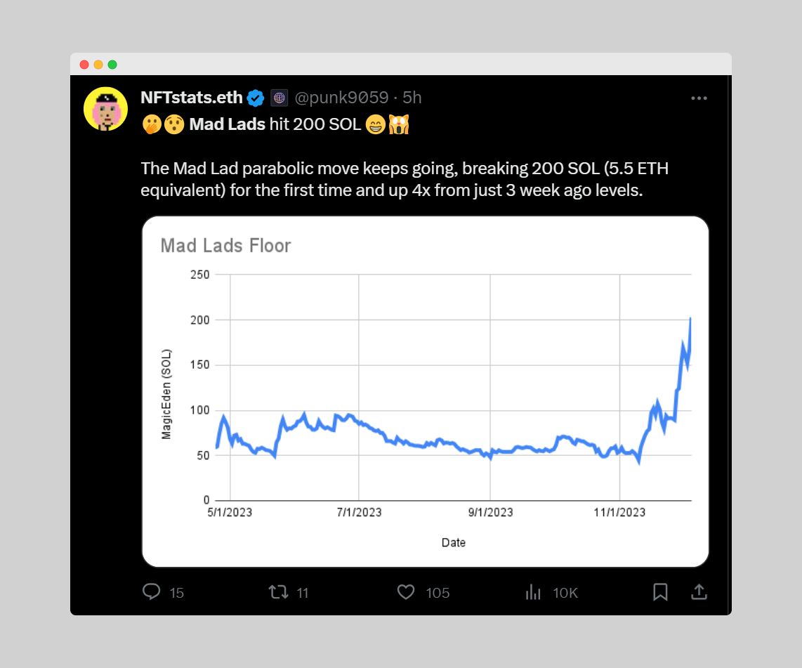 This big migration in is why weāve been seeing a lot of buy pressure among the top Solana NFT collections lately. In other words, newcomers have been looking to get footholds here, so theyāve been piling into established projects that are known quantities like Mad Lads.