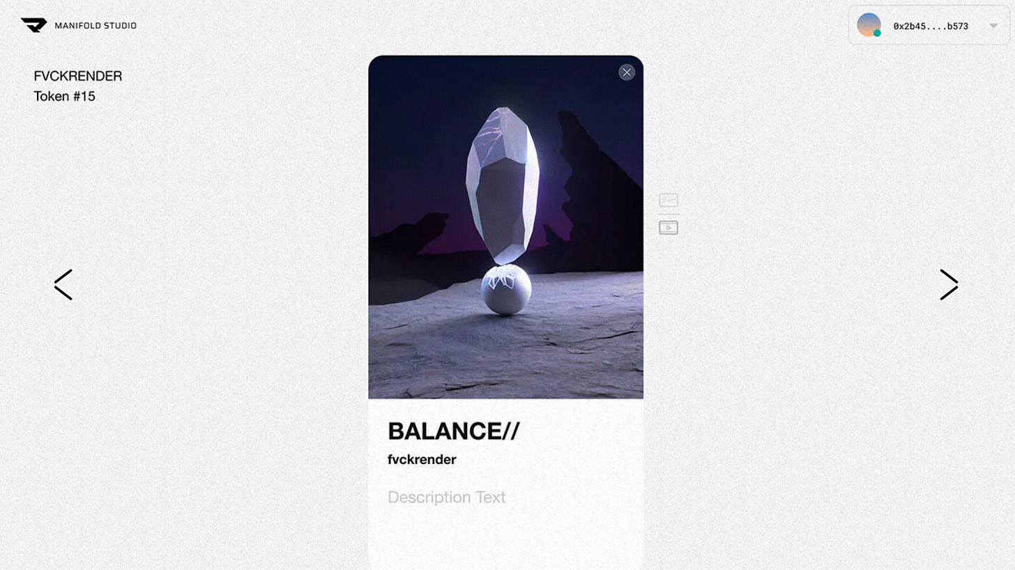 Manifold Creator grew out of white-label infra collaborations with leading crypto artists like FVCKRENDER, Mad Dog Jones, and Pak. Unveiled as an open-source resource in May, the Creator system emphasizes three main assurances: authenticity (i.e. decentralized permaweb provenance), extensibility (i.e. composable with NFT apps), and interoperability (i.e. compliant with popular NFT market standards.)