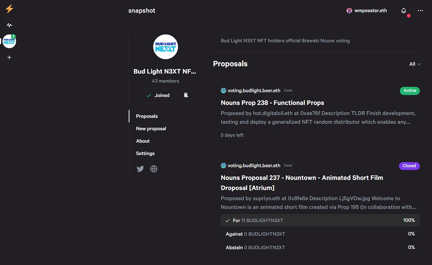 For example, once upon a time the Bud Light brand bought the appropriately beer-heeded Noun 179, and then the company wanted to let its community of N3XT NFT holders decide how to vote with this Noun on an ongoing basis. As you can see in the screenshot above, for this they turned to Snapshot where N3XT holders (myself included) collectively vote on decisions put to Noun 179 to this very day. If you need voting for your project, Snapshotâs definitely solid.Â