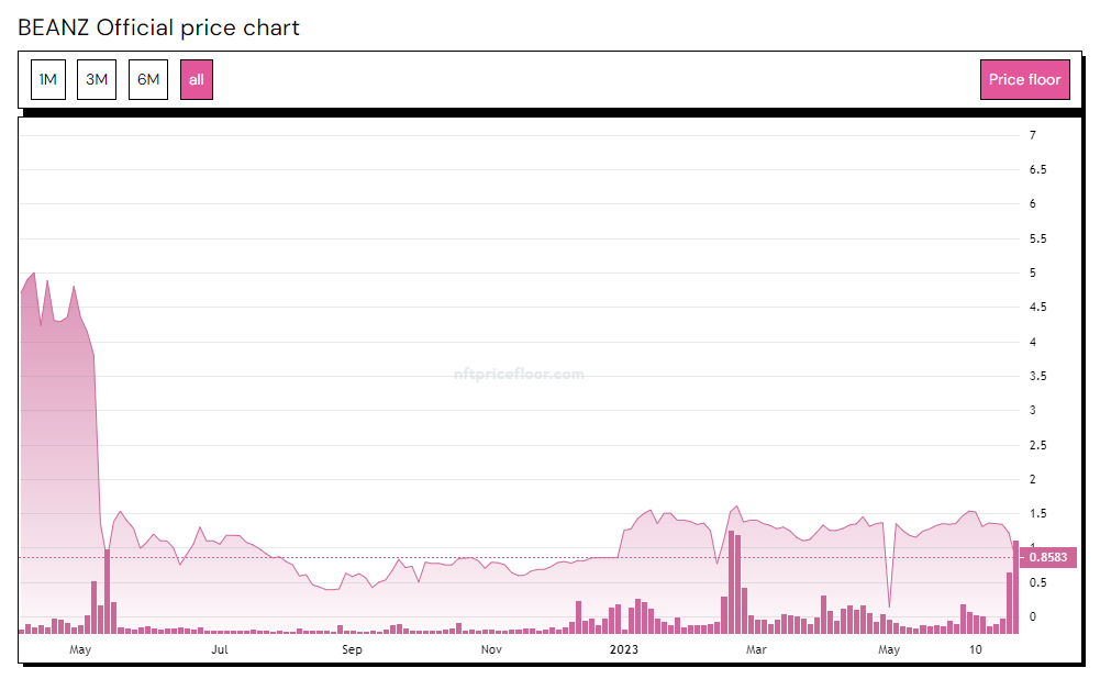 The chart above shows the all-time floor price data of BEANZ, which dropped in April 2022 as the second collection in the Azuki ecosystem. You can see in the secondary trading the BEANZ floor price quickly peaked at 5 ETH post-mint before trading at or below ~1.5 ETH ever since.