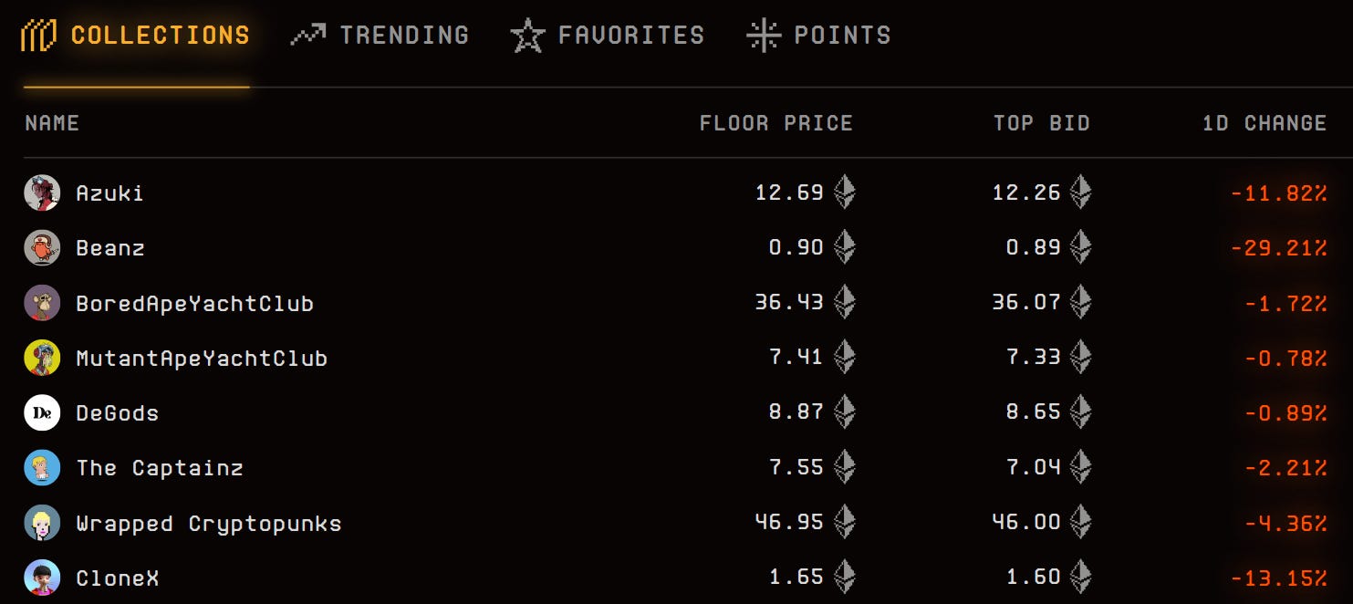 On a big mint day like today, it’s worth also zooming out to track how some of your other favorite or target collections are faring. For instance, the floor prices of many top NFT projects are currently down on the day as more than a few holders sold off to participate in the Elementals drop.