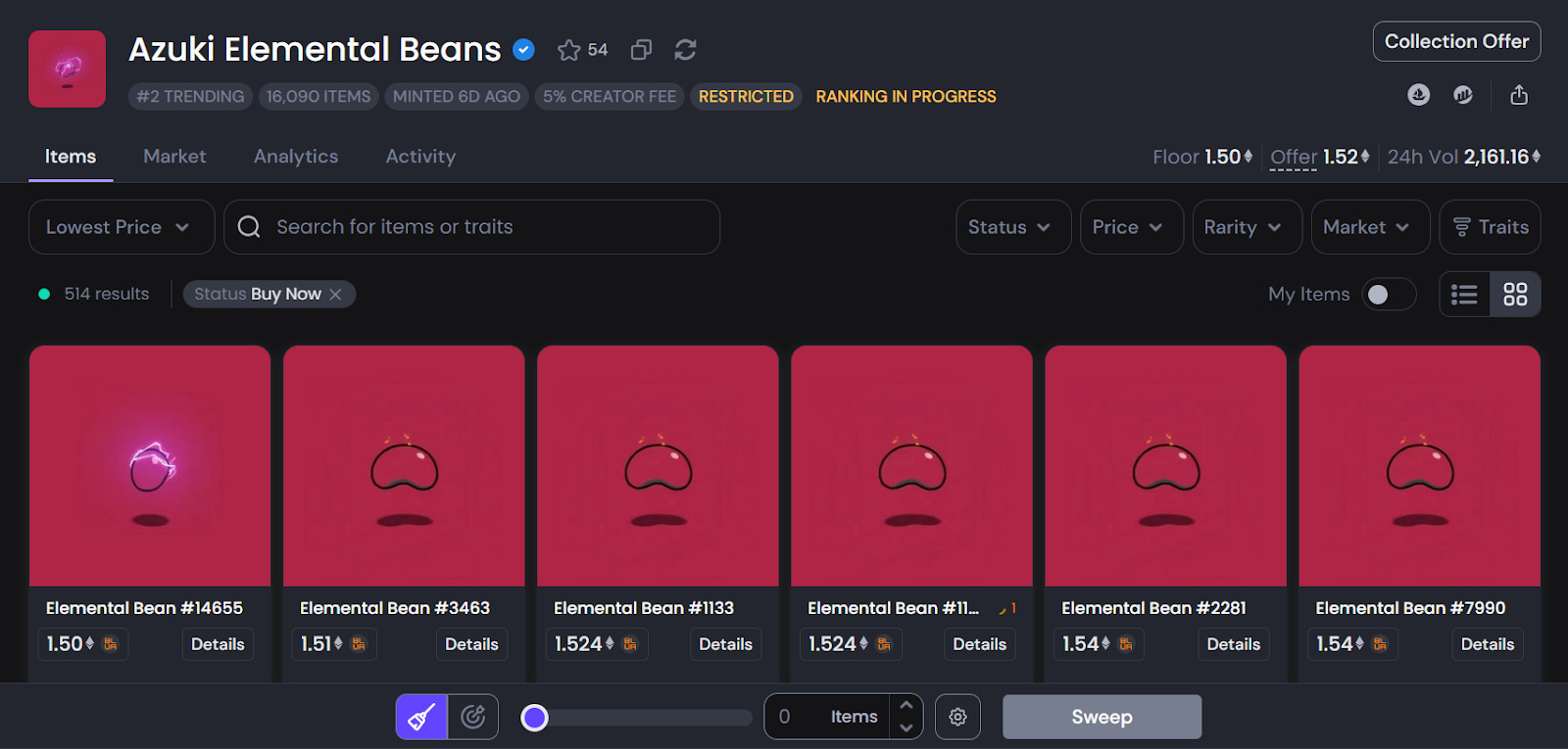 Also, keep in mind at this point you could also start exploring the “Traits” metadata and getting a feel for the collection’s rarity dynamics. In the case of Elementals, it will take some time for these dynamics to be fully understood since rarity rankings will be incomplete so long as there are unrevealed Azuki Elemental Beans left to be converted into Elementals. At the time of writing, only 2,000 out of +18,700 had been converted.