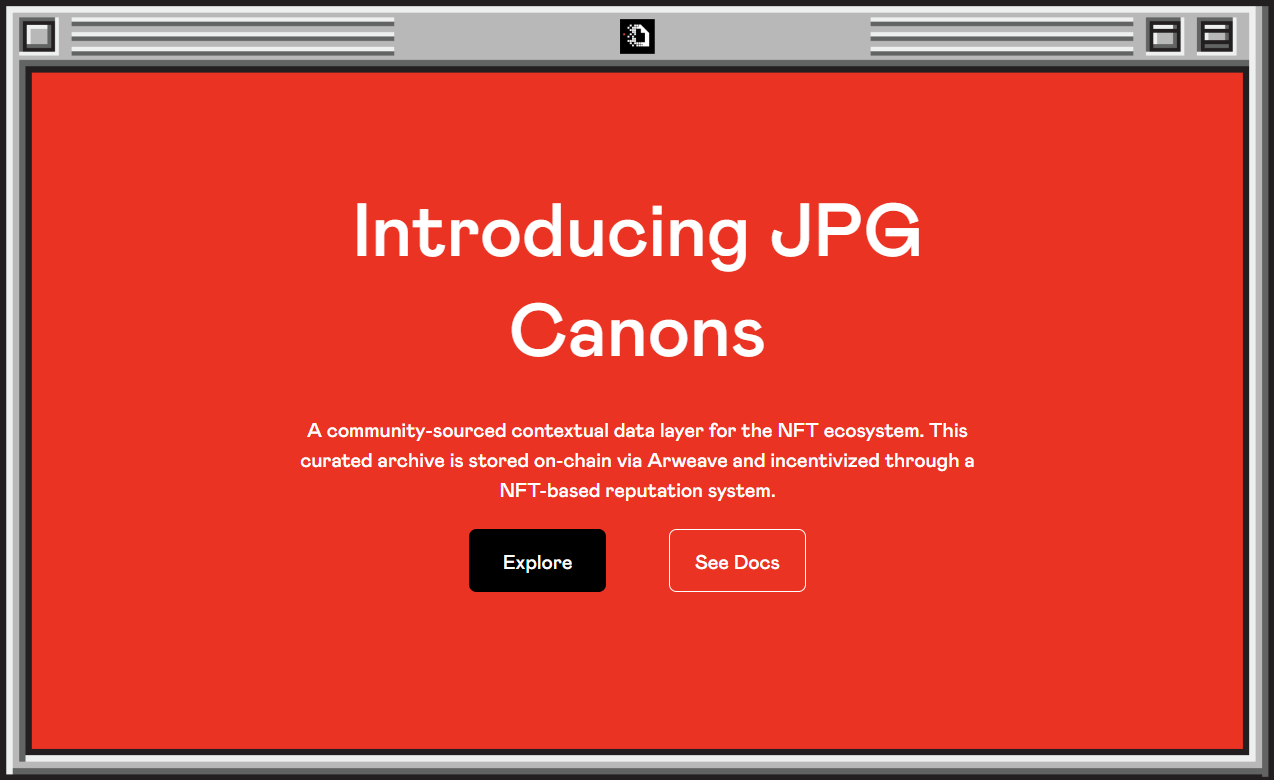 On the infra side is the new TCR system, JPG Canons. Built on Ethereum and also backed up on Arweave, these community-curated and community-governed lists will index NFTs and map out relational networks among them for improved cultural context in the NFT ecosystem.Â