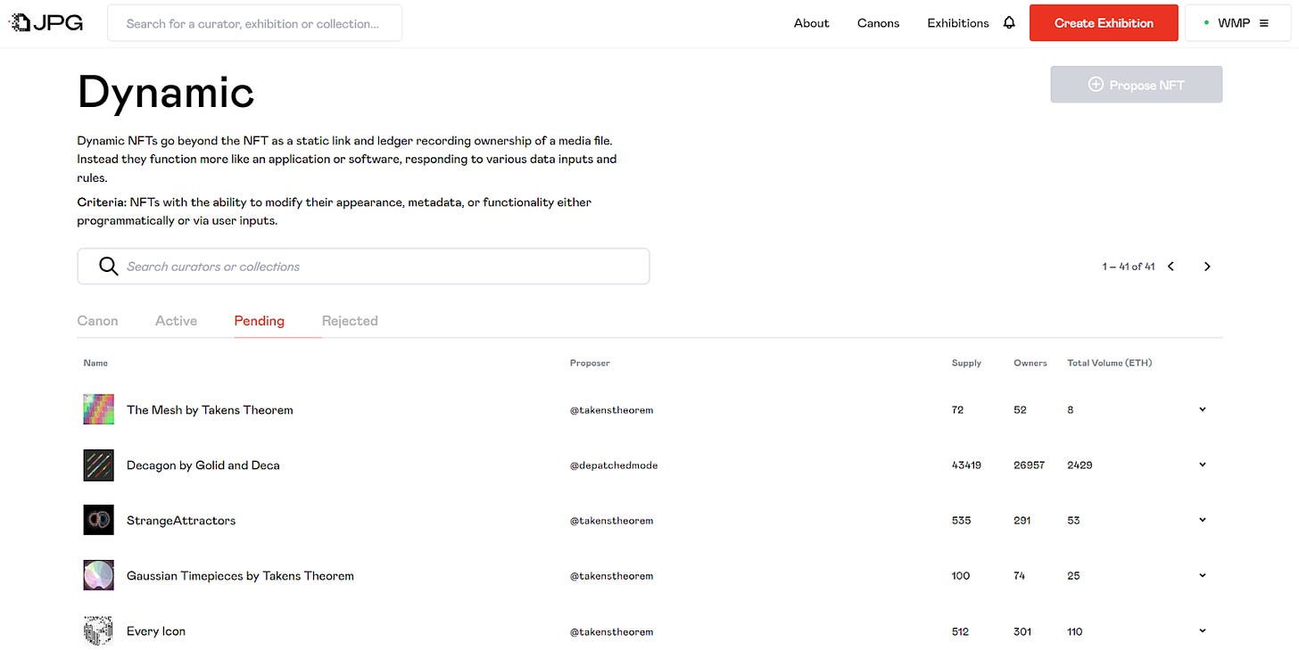 On the platform side of things are JPG Exhibitions, which anyone with an Ethereum address can use to create NFT galleries whose data is then backed up on Arweave, a decentralized storage network, for permanence.Â