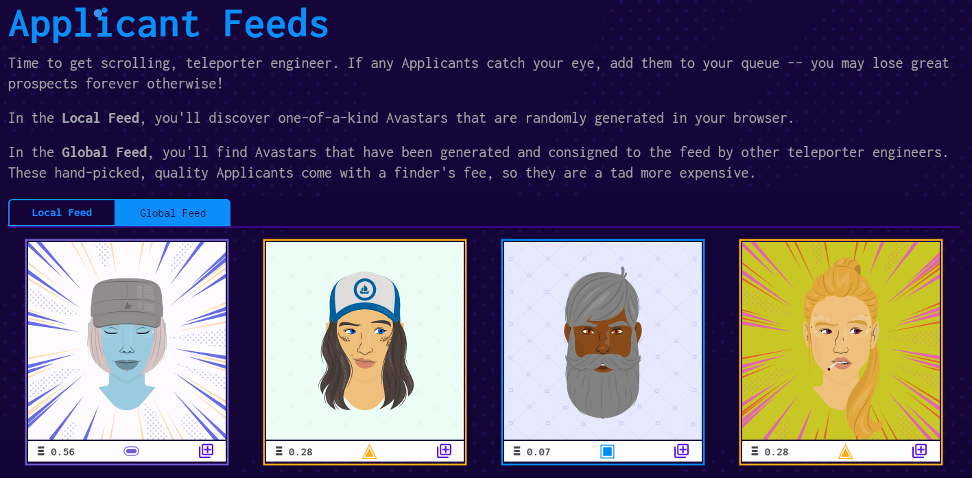Navigate here and you can instantly start scrolling the Local Feed and hunting for unique Avastars that are generated directly in your browser. If you find some you think will be popular, you can consign them to a Global Feed where you’ll earn a finder’s fee if other collectors buy any of your curations. To do so, you only have to sign an approval transaction.