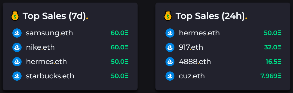 samsung.eth and nike.eth resold for 60 ETH respectively this week: