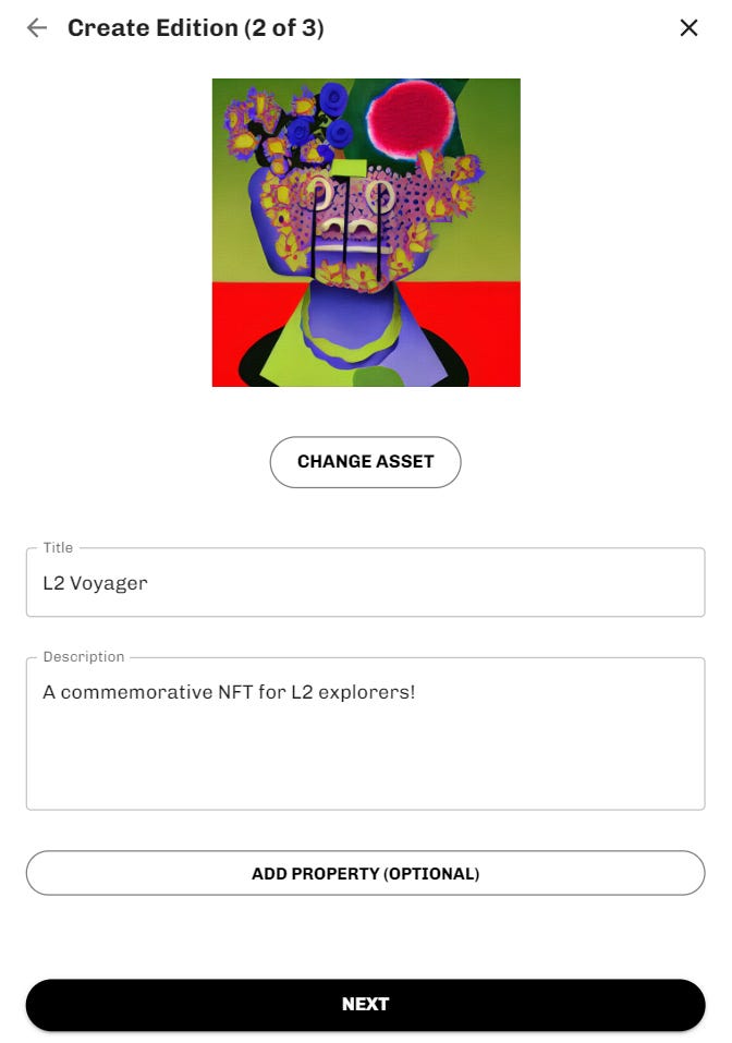 On the ensuing page upload the artwork to be minted, input a description, and then add additional metadata properties if you wish