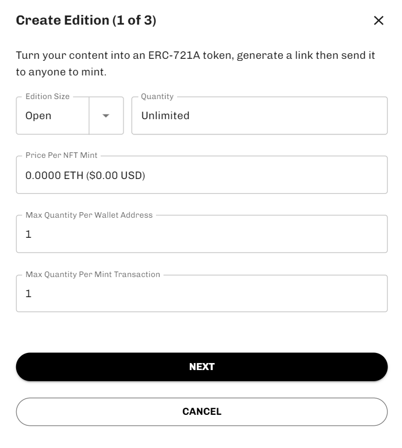 Select the âOpenâ edition size option and then input your âPrice Per NFTâ and âMax Quantityâ minting details