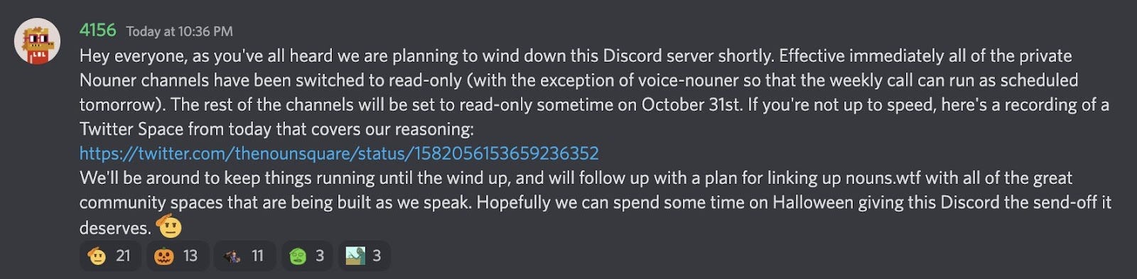 Interestingly, this week in the NFT ecosystem we saw this philosophy similarly embraced by Nouns DAO as the decentralized collective announced plans to wind down its centralized Discord server for good: