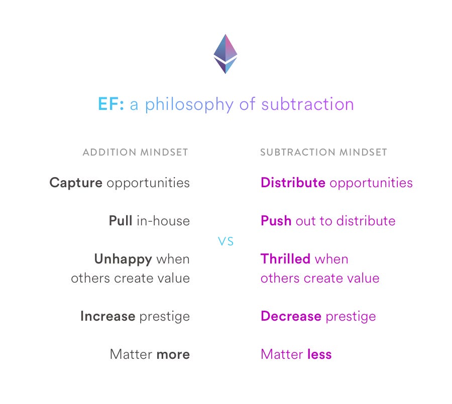 This entails subtracting power to avoid the “natural tendency of organizations to grow and accumulate power.” It’s all about fostering a strong decentralized Ethereum community that can thrive with or without the EF.