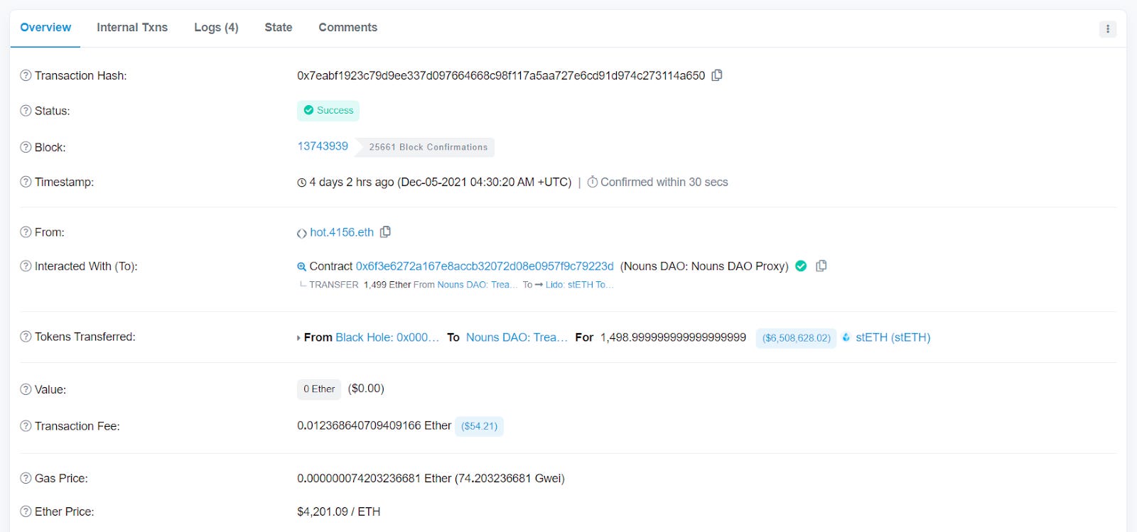 The news: On Dec. 5th, Nouns DAO completed its Lido staking plans and received its second installment of 1,498.99 stETH. Accordingly, the group now has both ETH and yield-bearing stETH on its balance sheet.