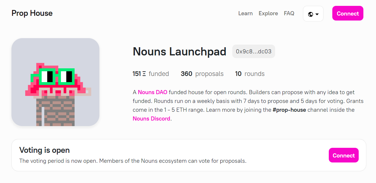 “As the winner of a funding round, you’ll receive the round’s funding amount and be invited to the Prop House builders Discord,” the Prop House FAQ explains. “You’ll have the support of the Nouns community to complete your proposal and apply for follow-on funding if needed.”