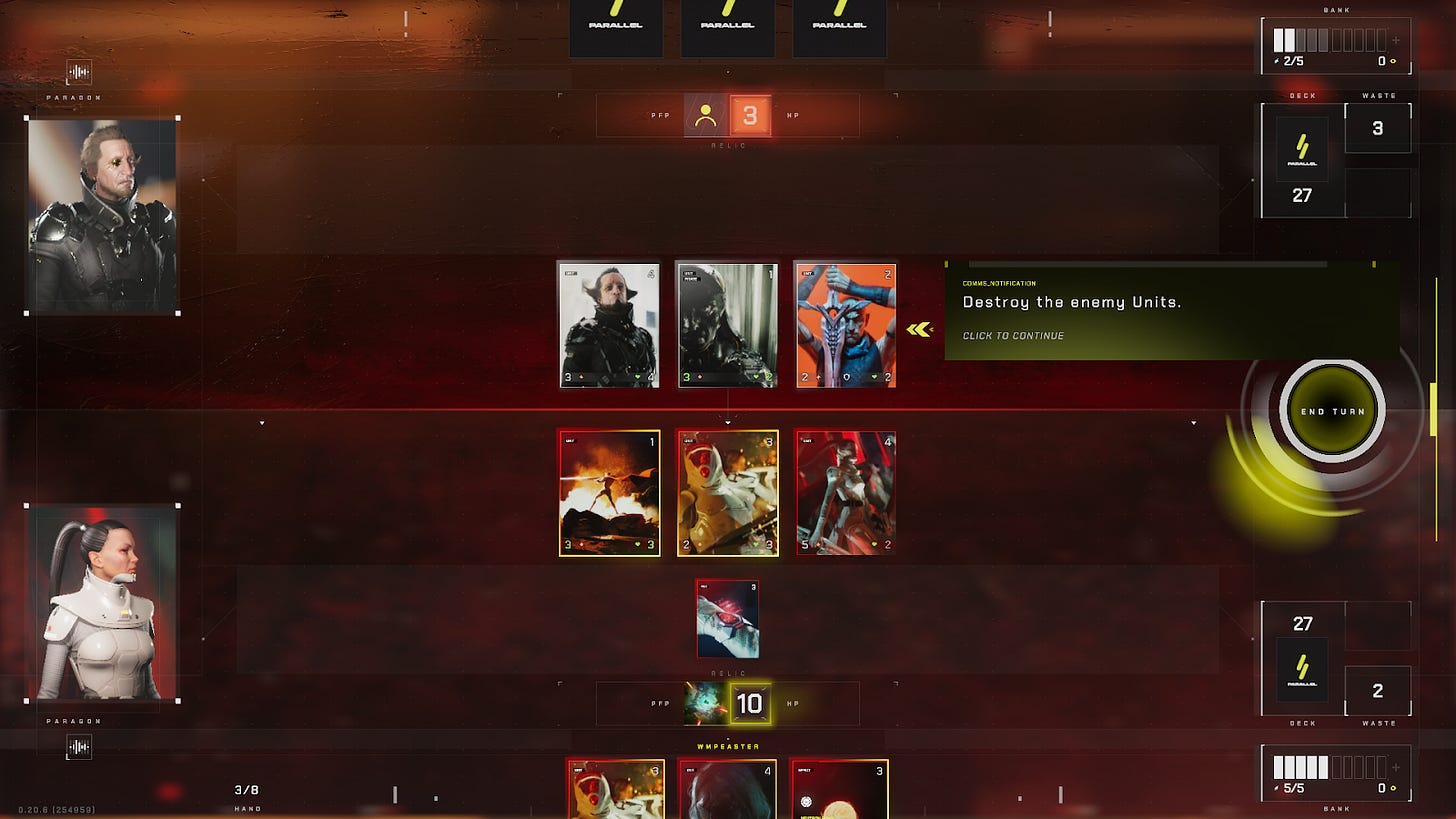 A special unit to be aware of is a "Paragon," a powerful character type that is both playable and offers persistent passive effects. Also in order to play cards in the first place, players must accumulate resources by “banking” cards into their Power Bank, which adds an element of strategic energy management to the game.