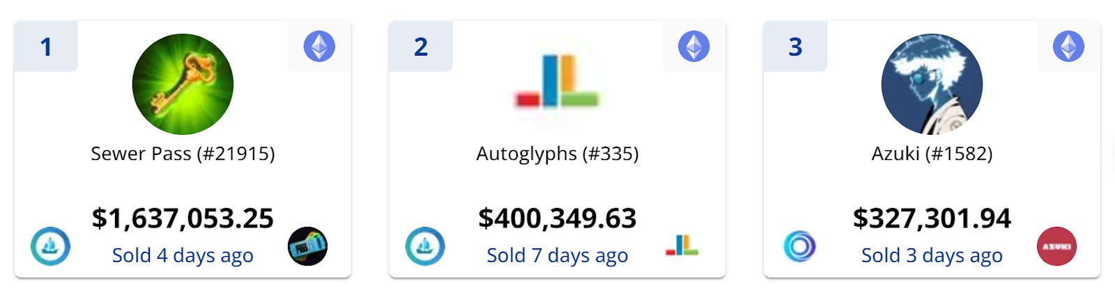 There were no sales of 'Punks or Apes in the top three largest transactions this week, but that wasnât for a lack of major activity. On Monday, Fortnite esports professional and Yuga Labs's "Dookey Dash" competition winner Mongraal grabbed headlines and a major bag when he accepted a staggering Î1,000 bid for his top Sewer Pass key NFT!