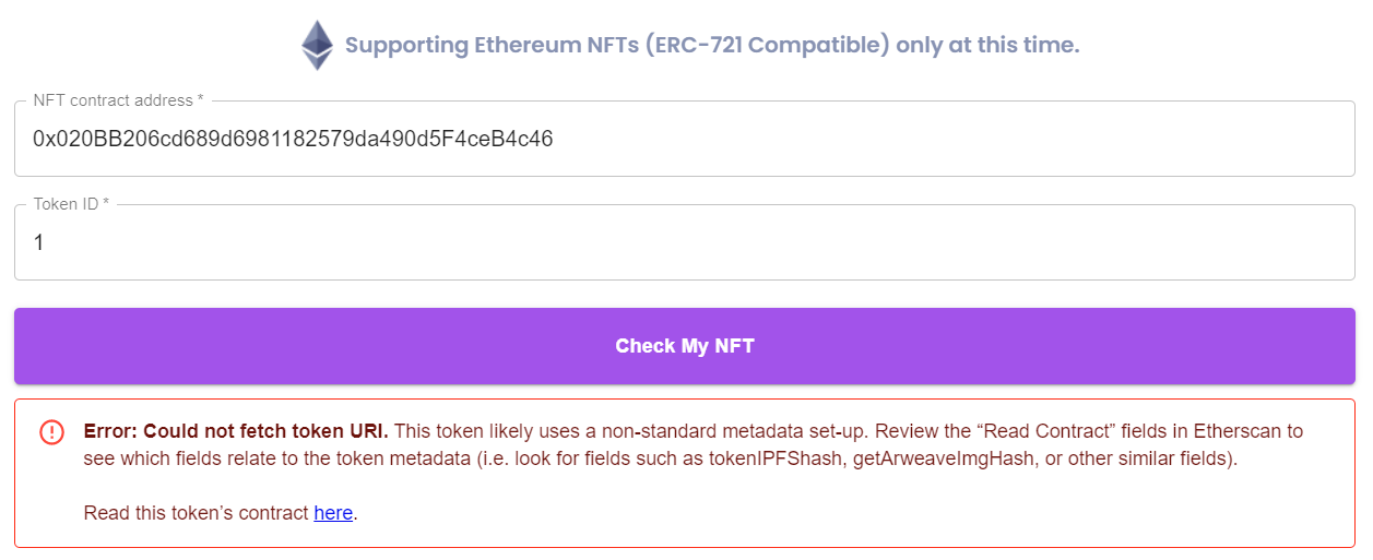 Zooming out, a helpful resource to consider here is Check My NFT, a search tool for easily checking how your NFTs are stored. For example plug the Racoon Secret Society contract address into Check My NFT with a valid TokenID and you’ll get the following error message …
