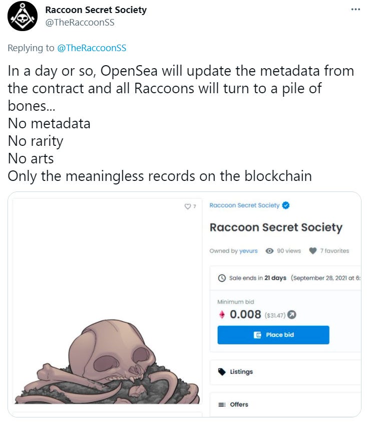 This model poses various risks, and one of them is that a project’s team doesn’t remove their ability to adjust where their NFTs point to and then takes advantage of that power. The Racoon Secret Society devs just showed us exactly what this kind of behavior can look like!