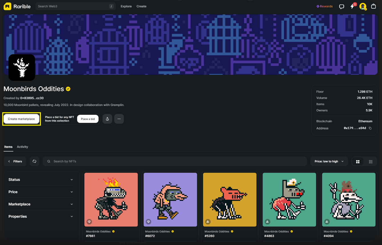 Creating an NFT collection with a tool like Bueno is just a first step in overseeing your own project. Instead of ceding all your projectâs ensuing trading activity to third-party marketplaces like Blur and OpenSea, you could then use the Rarible Marketplace Builder to create an âofficialâ trading hub for your collection, which comes with compelling advantages.Â