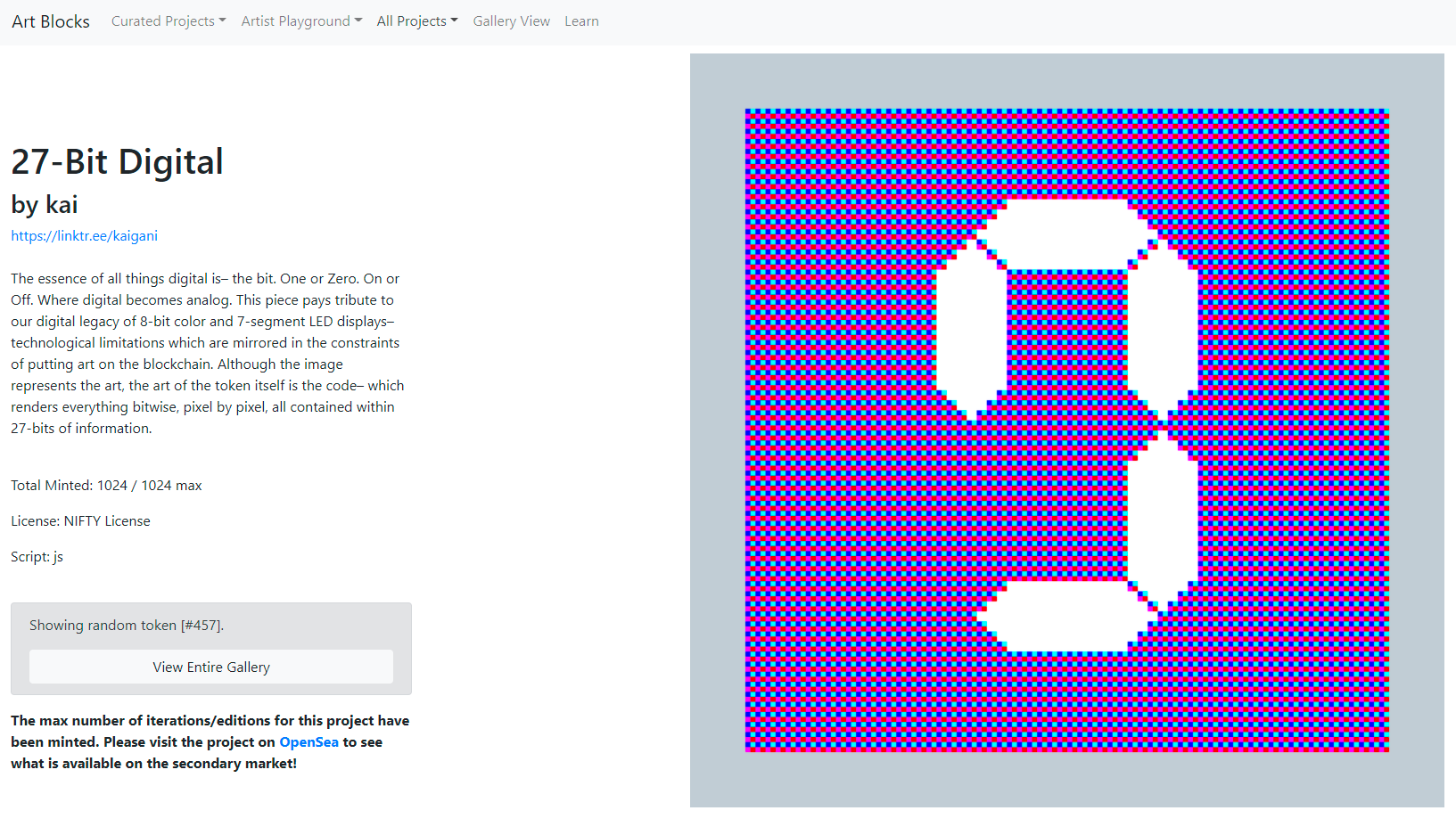 Kai’s 27-Bit Digital drop on generative art platform Art Blocks sold out in a matter of minutes …