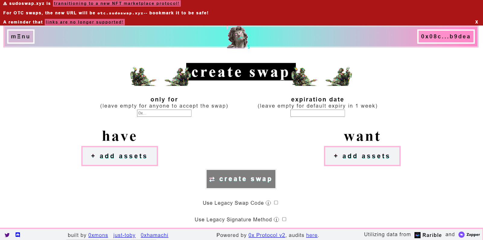 In January 2022, the sudoswap team phased out all links from the app’s website in an effort to deemphasize the OTC service ahead of the sudoAMM rollout. (Note: when sudoswap migrates to the sudoAMM, the project’s initial but deemphasized OTC service will remain indefinitely accessible at otc.sudoswap.xyz.)