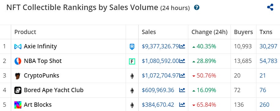This improved UX has led to a frenzy of trading lately, and you don’t have to look any further than Axie Infinity’s sales volume over the last day for stark evidence of that. Per Cryptoslam the game just facilitated over $9.3M worth of 24-hour sales, blowing the nearest oncomers NBA Top Shot ($1.08M) and CryptoPunks ($1.07M) out of the water in the same span.