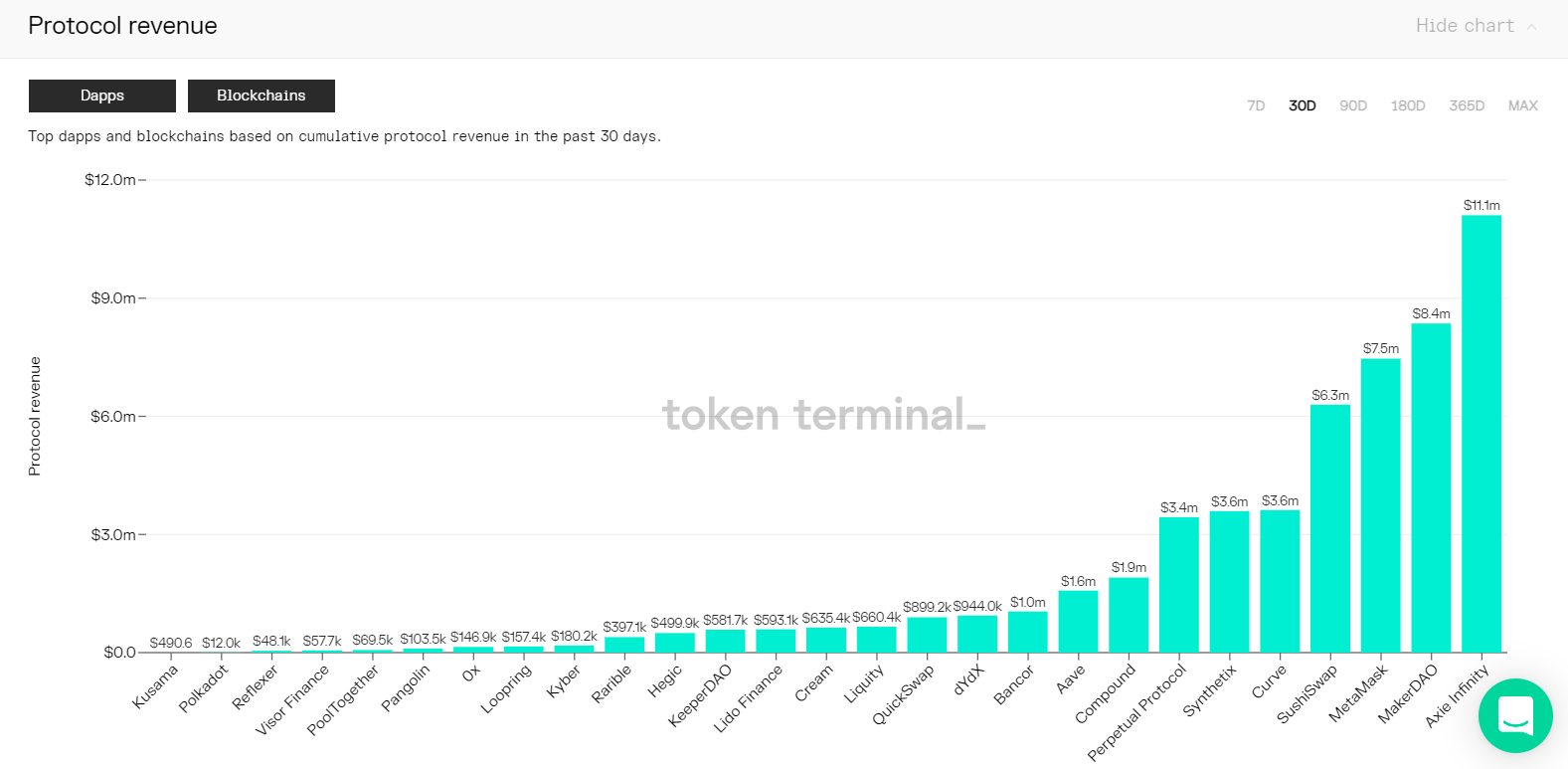 To put that into perspective, Axie Infinity is currently generating more 30-day protocol revenues than top DeFi apps like lending protocol Maker ($8.4M) and decentralized exchanges Sushi ($6.3M) and Curve ($3.6M)! As such, Axie Infinity presently accounts for no less than 20% of the total protocol revenues generated by all the dapp’s Token Terminal tracks right now.