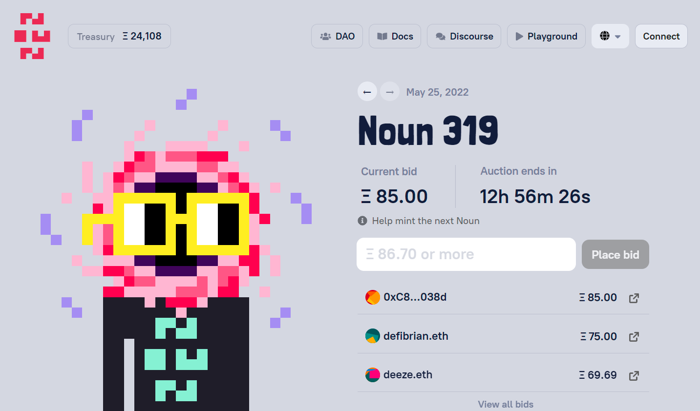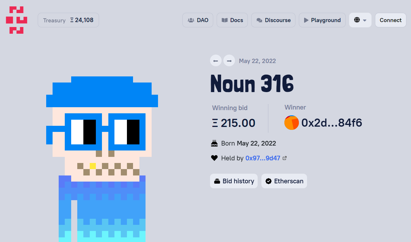 🎊 Check out the Noun Playground, Nouns Center, and Most Wanted Nouns to explore and learn more about Nouns