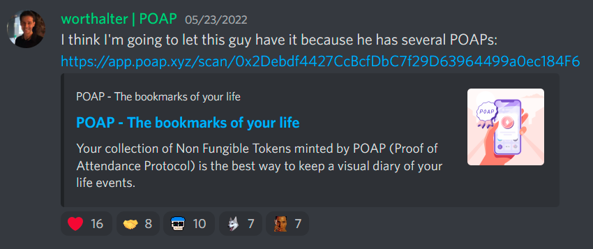 That latter pointed ENS domain is a reference to the holder of poap.eth, Patricio Worthalter, a longtime crypto veteran and founder of the popular Proof of Attendance Protocol, or POAP, project.