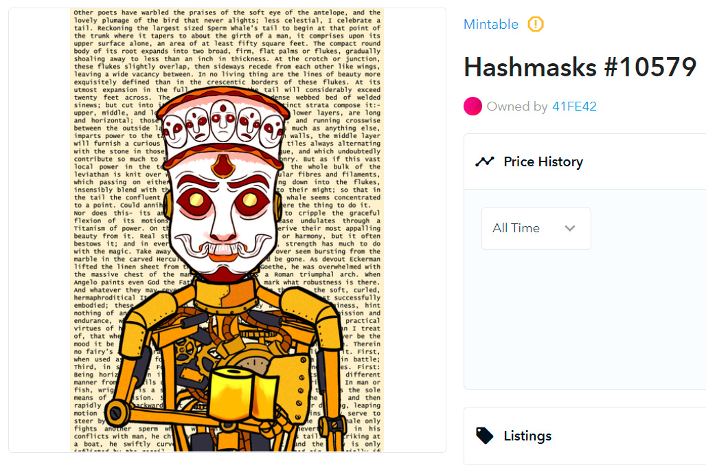 Amid all the buzz and excitement around Hashmasks, be safe and watch out for the current spate of opportunistic counterfeits on do-it-yourself NFT marketplaces. For example, below is a fake on OpenSea: it was created via Mintable and isn’t from the verified, blue-check Hashmasks collection …